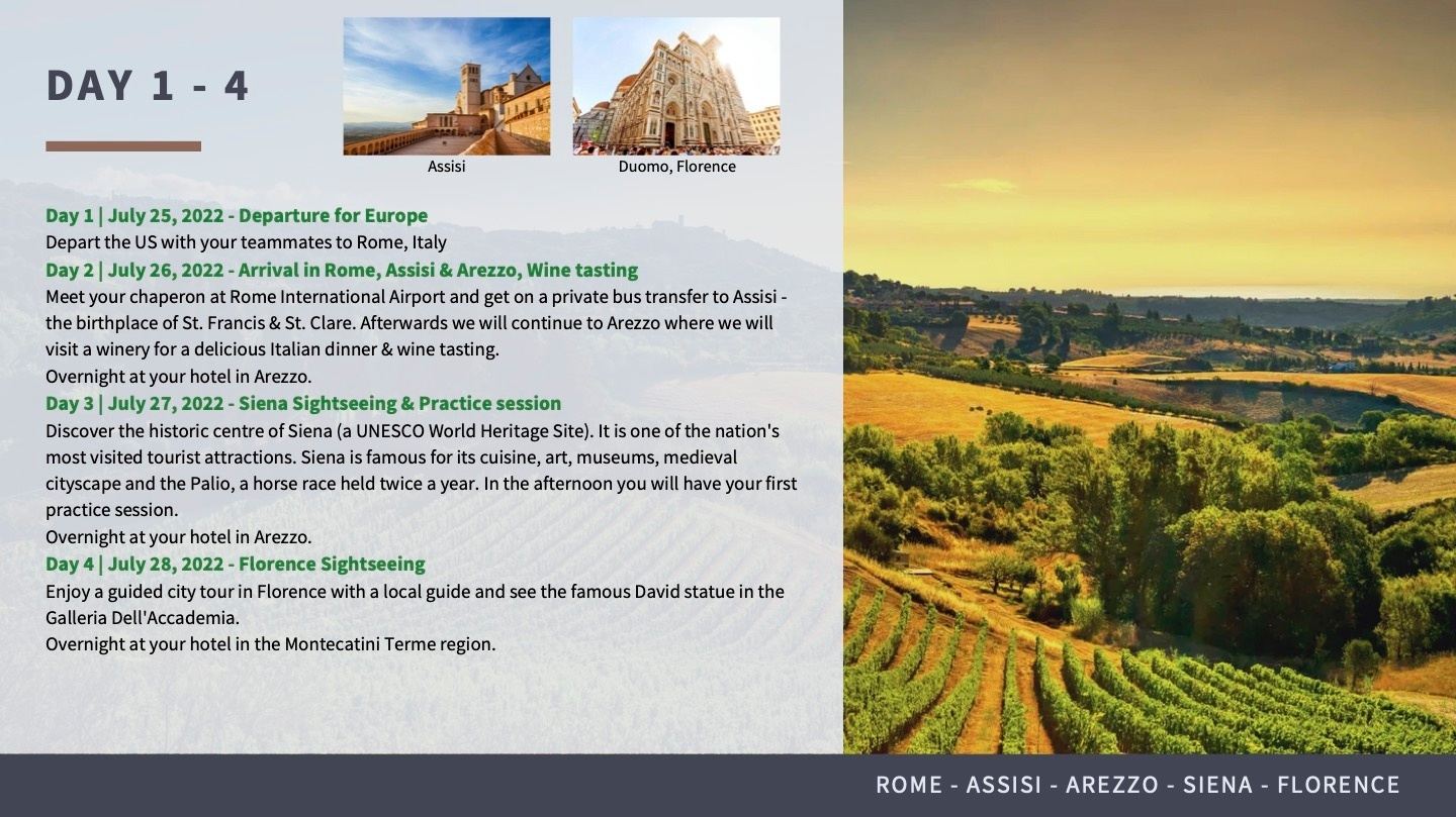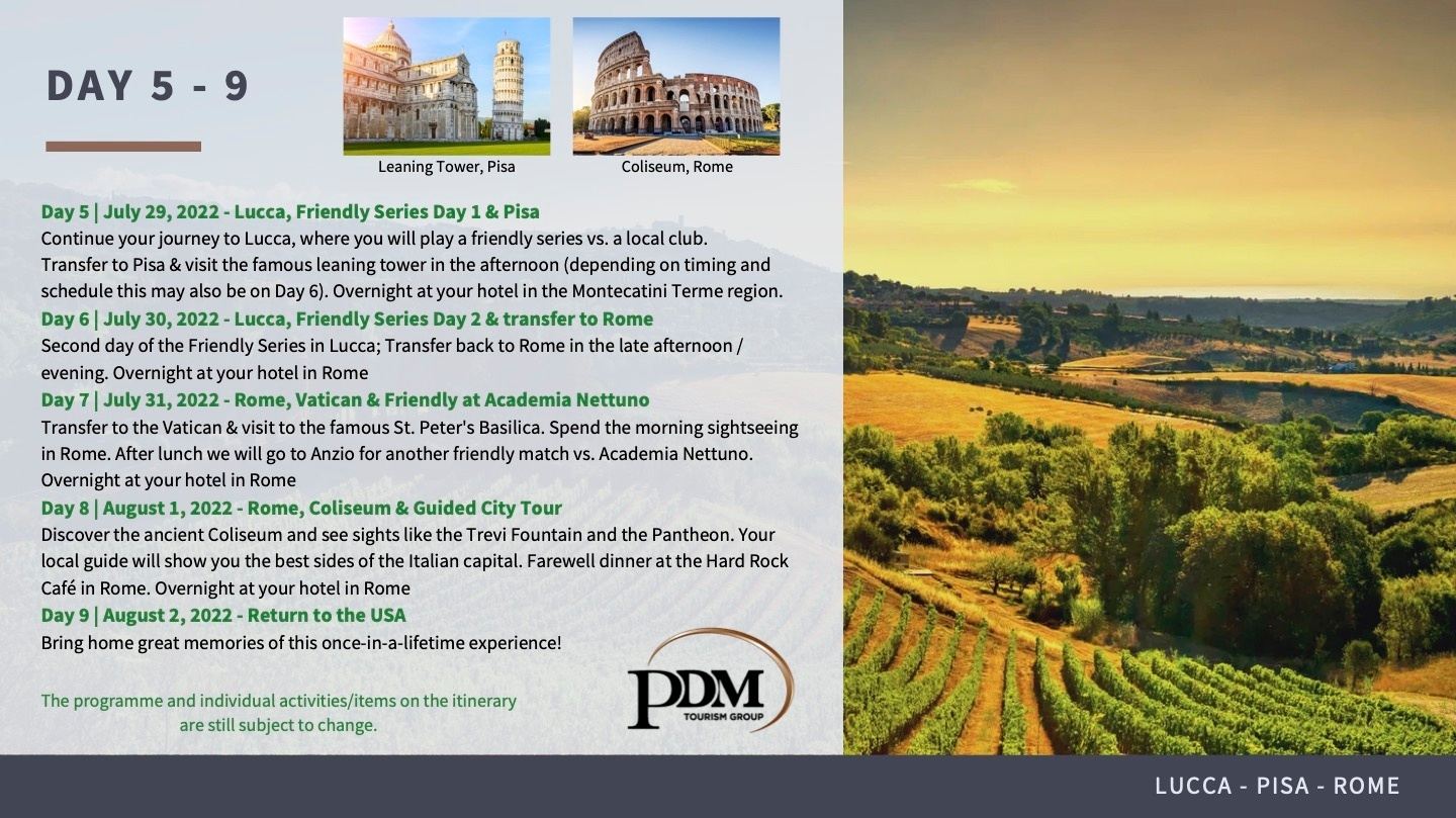 Loved everything about this trip. Very well organized, lots of tours & sightseeing, but still a good amount of free time. Really enjoyed that the hotel/food/transfers/tours were all included. My daughter really, really enjoyed her team & coaches, and they played some great ball! Chris & Casey were very accommodating and fantastic to deal with. Great families, some lifetime friendships made, and a wonderful overall experience!
